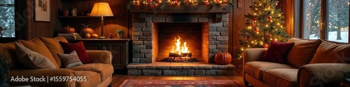 Cozy Fireplace Living Room Warm & Inviting Autumn Scene, Perfect for Relaxation and Holiday Themes