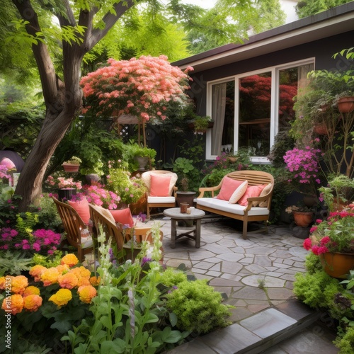 Cozy garden patio with comfortable furniture and vibrant flowering plants.