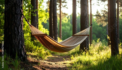 Cozy hammock hanging between trees in serene forest during golden hour with soft sunlight streaming through