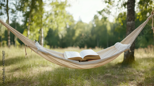 Cozy hammock strung between trees holds open book, inviting relaxation in nature