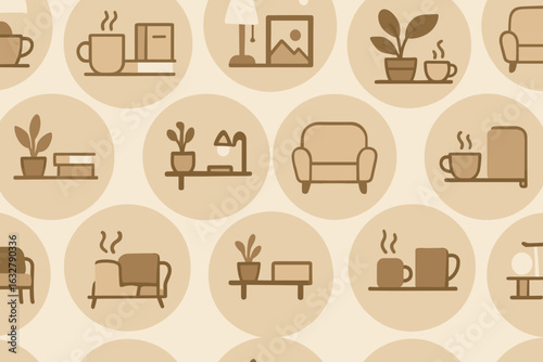 Cozy home decor elements featuring plants, coffee, and furniture in a warm, inviting pattern