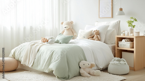 Cozy kids bedroom with pastel decor, soft rug, and plush toys