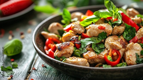 Cozy kitchen photography delicious chicken stir-fry with vibrant fresh veggies