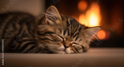 Cozy Kitten Napping Warmly by the Crackling Fireplace on a Cold Evening