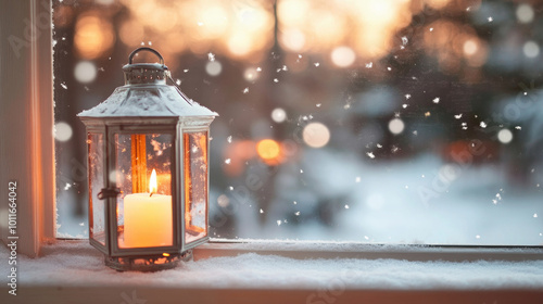 Cozy lantern glow, serene winter landscape framed by frosted window, soft light illuminating tranquil snow-covered scene.