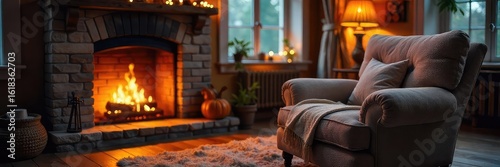 Cozy living room scene featuring a crackling fireplace, plush armchair, warm lighting, and a soft throw blanket, perfect for a relaxing evening at home , atmosphere, yellow, burning