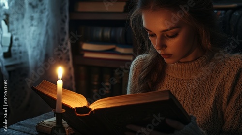 Cozy living room scene woman reads ancient book by candlelight