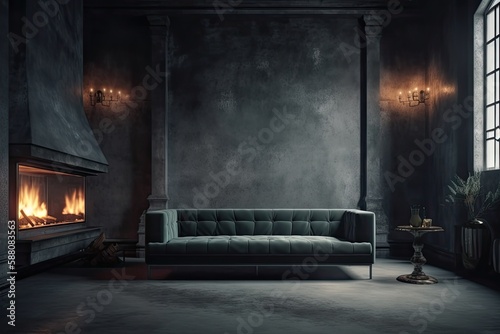 cozy living room with a fireplace and comfortable sofa. Generative AI