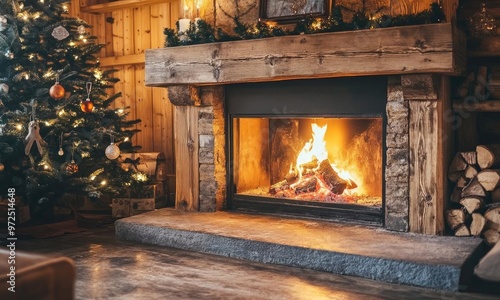 Cozy living room with a warm fireplace, decorated Christmas tree, and rustic wooden furnishings for a festive ambiance.