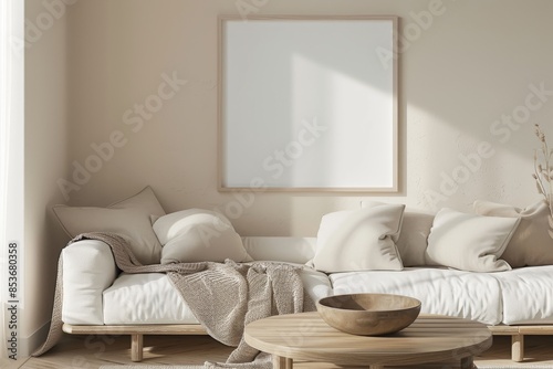 Cozy living room with an empty frame on the wall above a comfortable sofa
