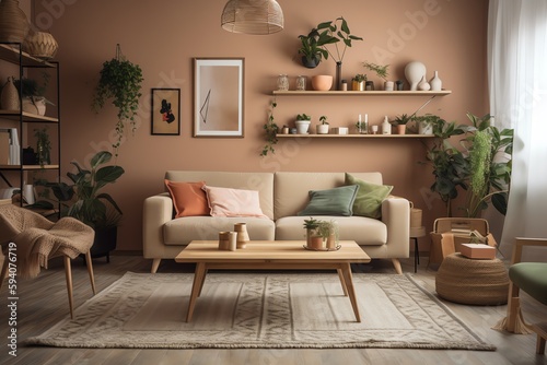 Cozy living room with beige sofa, plants, shelf, rug. Generative AI