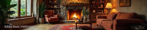 Cozy living room with warm lighting, featuring a fireplace, plush rug, and comfortable furniture, perfect for relaxation and creating a homely atmosphere , background, comfortable, modern