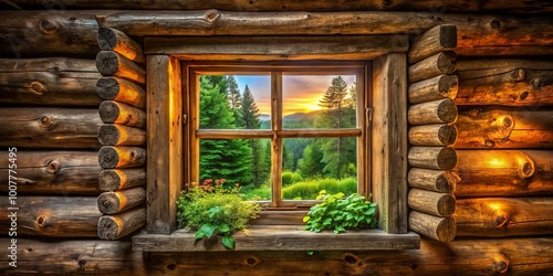 Cozy log cabin window with rustic wooden frame, surrounded by lush greenery, warmly lit from inside, evoking a
