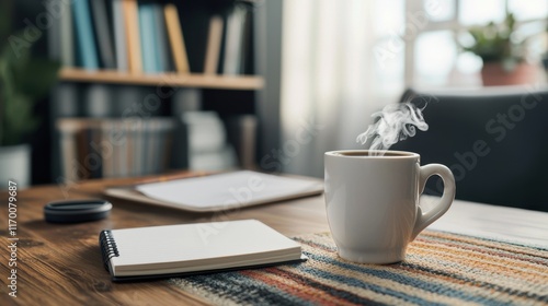Cozy Morning Scene with Coffee Cup and Notepad on Wooden Table