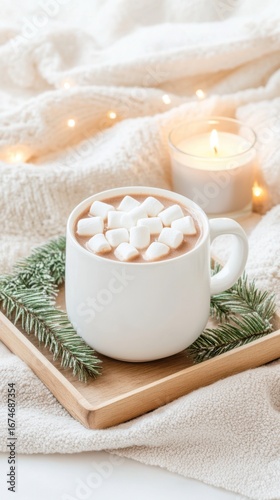 Cozy New Year still life with minimalist hot cocoa, marshmallows, pine branch, and candle on wooden tray for holiday design.