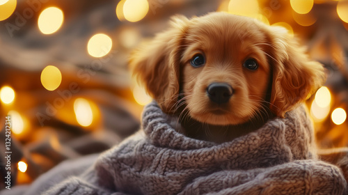 Cozy Puppy in Sweater Enjoys Festive Winter Ambiance With Lights