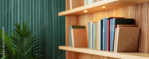 Cozy reading nook with bamboo bookshelves and soft lighting, ecofriendly retreat