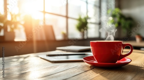 Cozy Red Coffee Cup with Steam on Table Against Sunlit Window