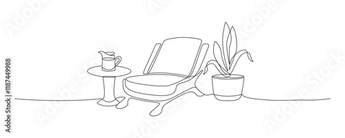 Cozy room interior drawn with continuous line in minimalism, abstract style, armchair, flower, coffee table, water decanter, one line, editable vector contour