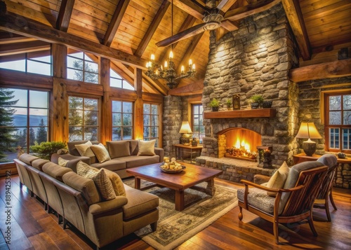 Cozy rustic cabin interior featuring exposed wooden beams, stone fireplace, plush furnishings, and warm lighting, evoking a sense of tranquility and secluded comfort.