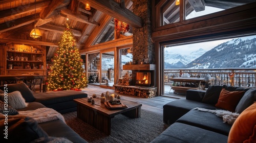 Cozy rustic chalet interior decorated for Christmas with mountain view