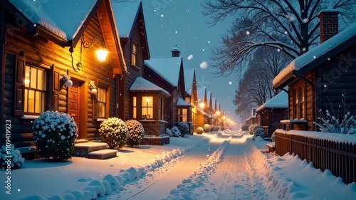 Cozy Snowy Street Glowing Lamps Winter Scene AI Photo, Snowy Street, Winter, Lamps, Cozy, Atmosphere, Depth, Mood, Lighting