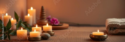 Cozy spa and wellness setting with soft candlelight creating a relaxing ambiance, self-care, calming