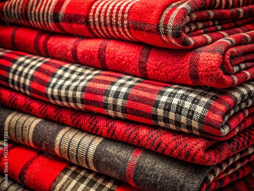 Cozy Stack of Plaid and Red Black Blankets - Macro Photography