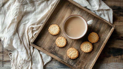 Cozy Tea Time with Cookies on Wooden Tray and Soft Textile Background