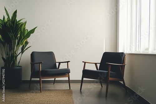Cozy waiting room with two chairs, modern minimalist. AI generated illustration.