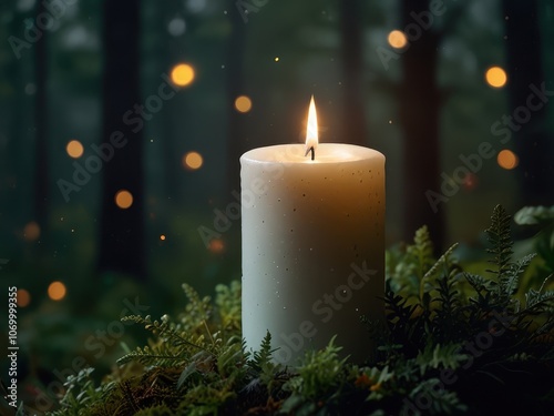 Cozy White Candle in Dark Green Autumn Forest with Fireflies, Fog, Bokeh, and Herbal Smoke