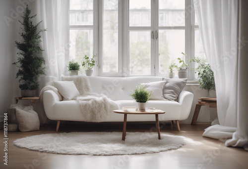 Cozy white sofa against window Scandinavian style home interior design of modern living room