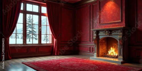 Cozy Winter Scene in a Luxurious Red Room with Fireplace and Snowy View