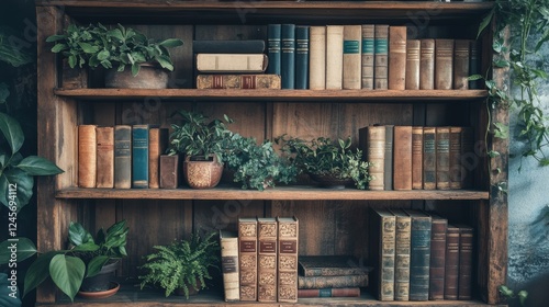 Cozy Wooden Bookshelf with Green Plants and Vintage Books Display