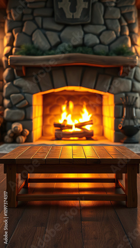 Cozy wooden table in front of a roaring fireplace with crackling logs, fire, home, winter, warm