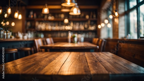 Cozy wooden tables and chairs in empty rustic style cafe interior with warm lighting, inviting atmosphere, modern coffee shop design, relaxation and hospitality concept