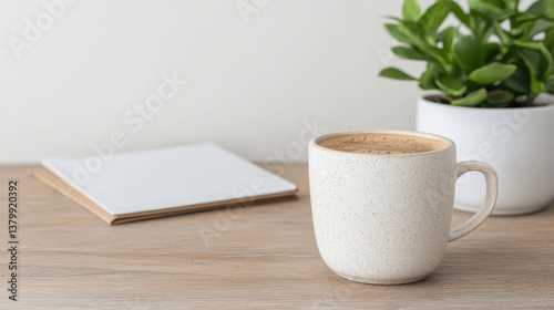 cozy workspace featuring cup of coffee, notebook, and potted plant creates serene atmosphere