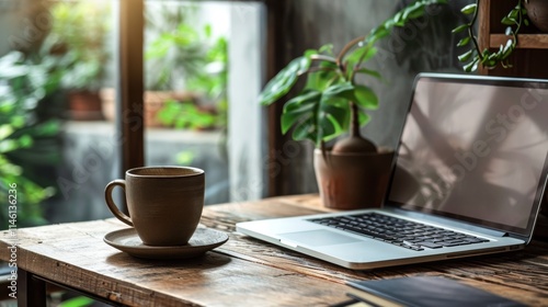 Cozy workspace with a laptop, coffee cup, and potted plants
