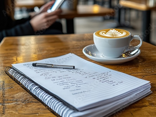 Cozy Workspace with Coffee and Notebook on Wooden Table in a Relaxed Cafe Environment