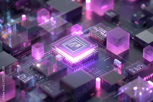 CPU Isometric. Modern Technology in Purple Light Effect. Glowing Glass Microchip Processor