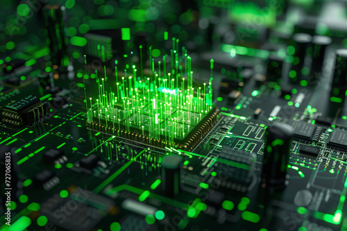 CPU Neon Flow: A Futuristic Representation of Advanced Technology with Green Data Flowing Across a Microchip and Motherboard
