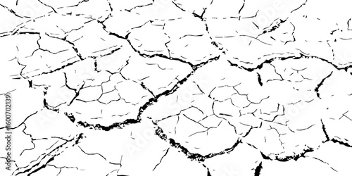 Cracked dry earth texture in high contrast black and white, resembling parched soil or desert floor. Ideal for backgrounds, nature-themed designs, or illustrating drought and environmental concepts.