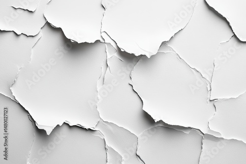 Cracked white surface texture. Detailed close-up view of a fractured white material, appearing like a damaged wall or paper. Sharp, irregular cracks crisscross the surface