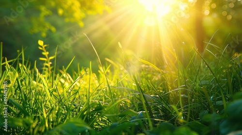 Craft a captivating photo of a sun-drenched meadow carpeted in lush green grass, with golden shafts of light filtering through the foliage.