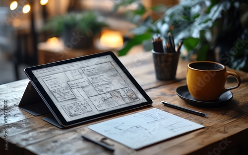 Craft a detailed artist charcoal sketch of a new landscape iPad product on a table, showcasing the products design with expressive shading