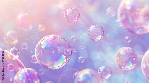 Craft a serene image of soap bubbles floating softly against a pastel-colored backdrop. Highlight the iridescent colors and reflections on each bubble, creating a tranquil and magical atmosphere.