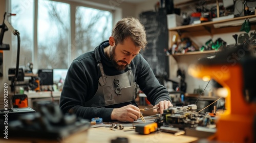 Crafting precision a skilled artisan working on mechanical projects in a workshop setting focused on innovative designs and techniques