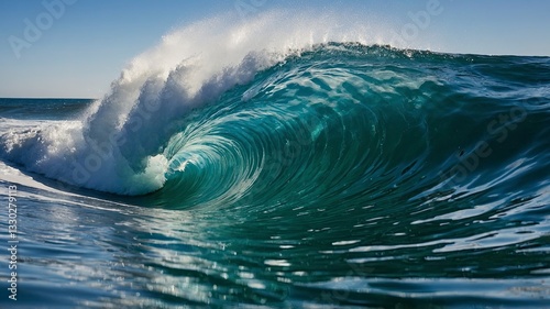 Crashing Ocean Wave Curls Powerfully with Spray Against Clear Blue Sky