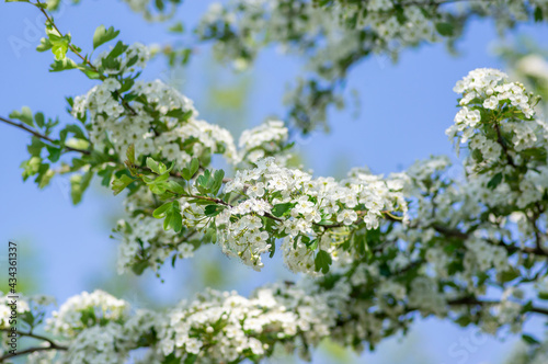 Crataegus laevigata hawthorn tree in bloom during springtime, branches with green leaves and group of flowers and buds petals
