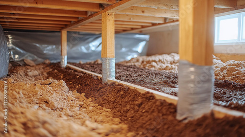 Crawl space with exposed soil and wooden beams showing the need for repair and mold remediation, with modern blurred background and empty caption space on the side